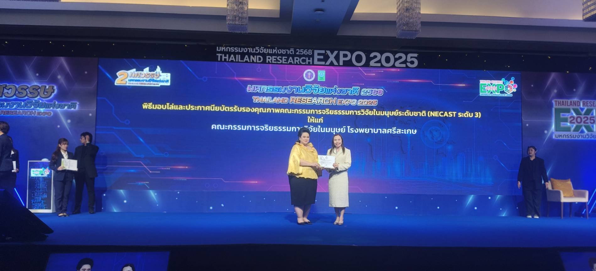 เข้ารับมอบโล่และประกาศนียบัตรรับรองคุณภาพคณะกรรมการจริยธรรมการวิจัยในมนุษย์ระดับชาติ (NECAST ระดับ 3) ณ งานมหกรรมงานวิจัยแห่งชาติ 2568 (Thailand Research Expo 2025)